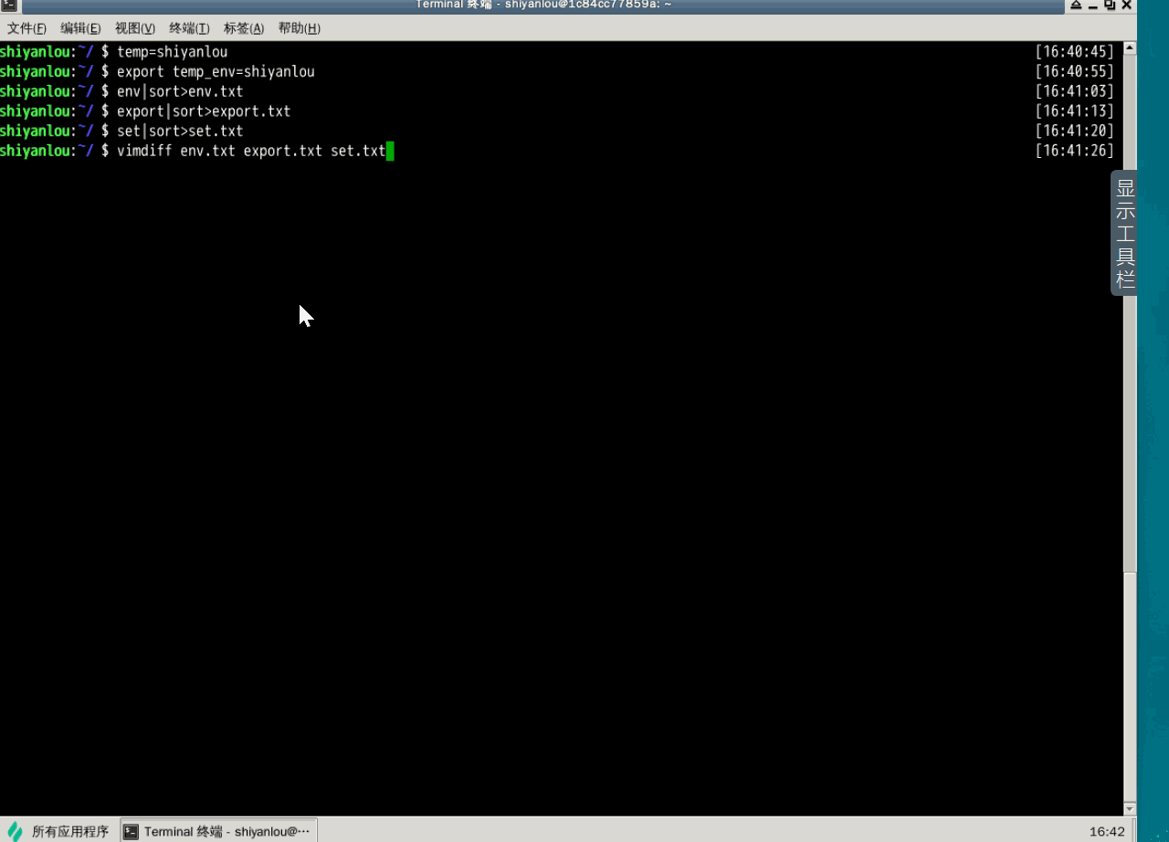 关于哪些变量是环境变量,可以简单地理解成在当前进程的子进程有效则为环境变量,否则不是(有些人也将所有变量统称为环境变量,只是以全局环境变量和局部环境变量进行区分,我们只要理解它们的实质区别即可)。我们这里用 export 命令来体会一下,先在 Shell 中设置一个变量 temp=shiyanlou,然后再新创建一个子 Shell 查看 temp 变量的值: