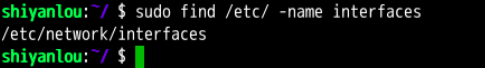 这条命令表示去 /etc/ 目录下面 ,搜索名字叫做 interfaces 的文件或者目录。这是 find 命令最常见的格式,千万记住 find 的第一个参数是要搜索的地方。命令前面加上 sudo 是因为 shiyanlou 只是普通用户,对 /etc 目录下的很多文件都没有访问的权限,如果是 root 用户则不用使用。
