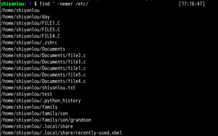 列出用户家目录下比 /etc 目录新的文件: