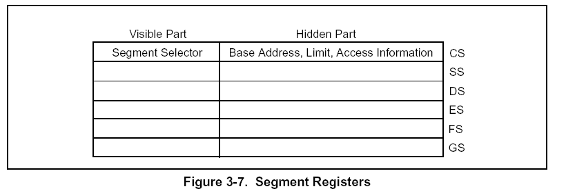 每个段寄存器都由“可见”部分和“不可见”部分组成。(有时,不可见部分也被称为“描述符缓存”或者“影子缓存器”)。当段选择符被加载到一个段寄存器的可见部分时,处理器也通过段选择符所指向的段描述符获取了这个段寄存器的不可见信息:段基址、段限长和访问权限。