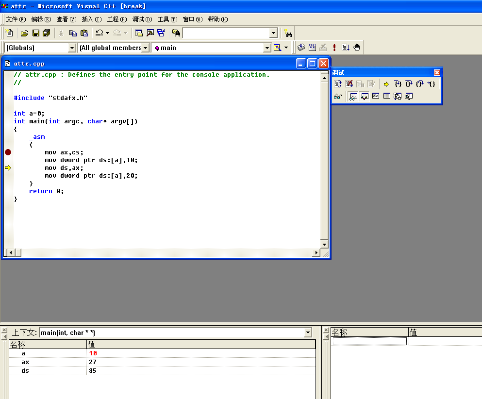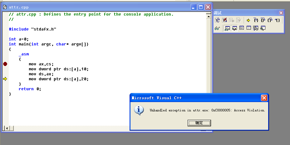 上述操作时将 cs 寄存器赋值给 ax 寄存器,之后又将常量 10 复制给段寄存器中的变量 a,再往下执行就会报错,因为段寄存器 cs 刻度不可写。原来的 ds 是可读可写的,但将 cs 通过 ax 赋值给 ds 的时候,ds 已经不是原来的 ds,而是 cs,所以会报异常。