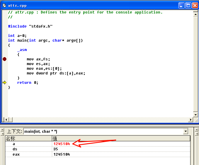 代码说明,主要是将 fs 寄存器通过 ax 赋值到 es 寄存器,然后获取 es 寄存器的 Base 再通过 eax 赋值给段寄存器中的变量 a。执行结果如下所示: