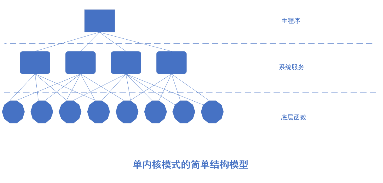 Linux 内核对于操作系统来说其实是单内核模式,这样对于操作系统所提供的服务流程主要为:应用主程序使用指定的参数值执行系统调用指令( int 0x80 ),使得 CPU 从用户态切换到了内核态,然后操作系统根据具体的参数值调用特定的服务程序,而这些服务程序在完成了对应的执行操作后,操作系统再次使得 CPU 从内核态切换回到用户态,从而返回到应用程序中继续执行。因此,可以将 Linux 内核简单概括为三个层次:调用服务程序的主程序层、执行系统调用的服务层和支持系统调用的底层函数。具体如下图所示: