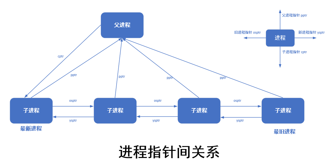 p_pptr是指向父进程任务结构的指针p_cptr是指向最新子进程任务结构的指针p_ysptr是指向比自己后创建的相邻进程的指针p_isptr是指向比自己早创建的相邻进程的指针