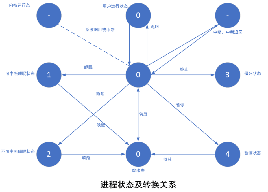 一个进程在生存期内,可以处于不同的状态并且相互转换,这样的状态称为进程状态。进程的当前状态保存在刚刚我们描述过的字段 state 中。当进程正在等待系统中的资源而处于等待状态时,称为睡眠等待状态。在 Linux 系统中,睡眠等待状态分为可中断和不可中断的等待状态。进程具体状态转换关系如下图所示: