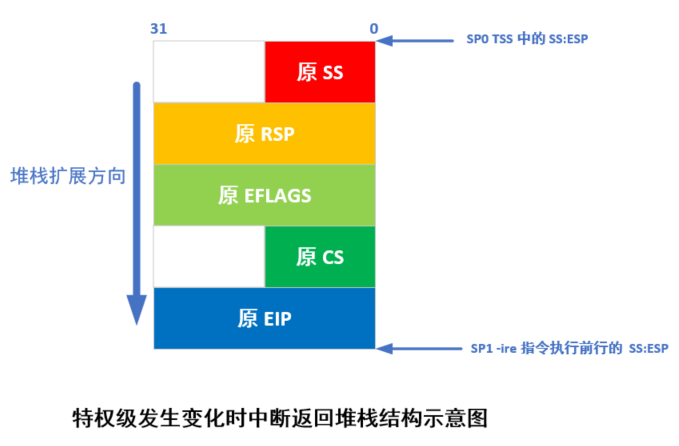 当执行 iret 指令时, CPU 把返回地址送入 CS:EIP 中,同时弹出堆栈中标志寄存器内容。由于 CPU 判断出目的代码段的特权级为 3 ,与当前内核态的 0 级不同,于是 CPU 会把堆栈中的堆栈段选择符和堆栈指针弹出到 SS:ESP 中。由于特权级发生了变化,段寄存器 DS 、 ES 、 FS 以及 GS 的值变得无效,此时 CPU 会把这些段寄存器清零,因此在执行了 iret 指令后需要重新加载这些寄存器。这之后,系统就开始以特权级 3 运行在进程 0 的代码上,所使用的用户态堆栈还是原来移动之前使用的堆栈,而内核态的堆栈则被指定为其任务数据结构所在的页面的顶端开始( PAGE_SIZE + (long)&init_task )。之后在创建新进程时,需要复制进程 0 的任务数据结构,包括用户堆栈指针,因此要求进程 0 的用户态堆栈在创建进程 1 之前保持“干净”状态。