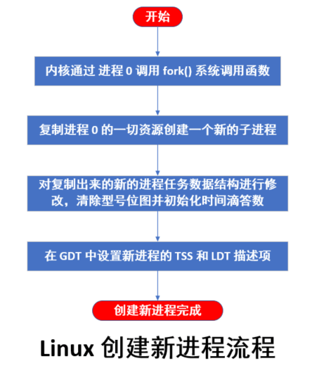 Linux 内核中创建新进程使用 fork() 系统调用。所有内核中管理的进程都是通过复制进程 0 而得到的,所以在 Linux 系统下运行的进程最初都是由进程 0 产生的子进程。