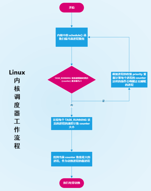 Linux 内核中的 schedule() 函数首先扫描进程数组,通过比较每个就绪态( TASK_RUNNING )进程的运行时间递减滴答计数 counter 的值来确定当前哪个进程运行的时间最少,counter 的数值越大表示剩余的运行时间越大,于是就选中该进程并使用进程切换宏函数来进行切换到该进程到 CPU 进行运行。