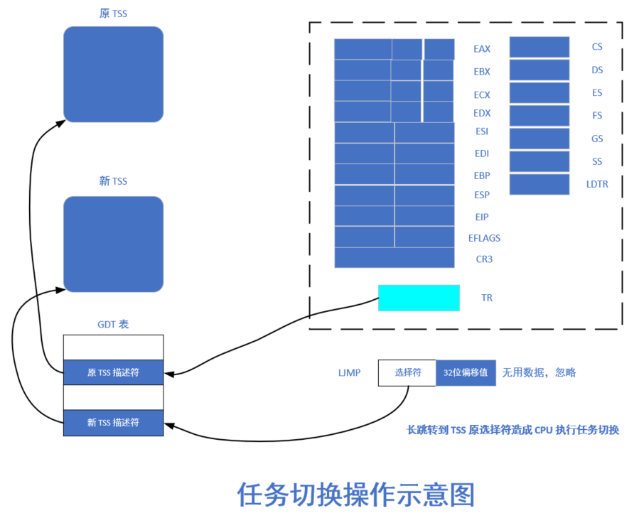 每当选择出一个新的可执行的进程时, schedule() 函数就会调用定义在 Linux 内核源代码中的 include/asm/system.h 中的 switch_to() 宏执行实际进程切换操作。该宏会把 CPU 的当前进程状态(上下文)替换成新进程的状态。在进行切换之前,switch_to() 宏会先检查要切换到的进程是否就是当前进程,如果是则调出流程(什么也不做),直接退出;否则,就先将内核全局变量 current 设置成新任务的指针,然后长跳转到新任务的任务状态段 TSS 组成的地址处,造成 CPU 执行任务切换操作。此时,CPU 会把所有寄存器的状态保存到当前任务寄存器 TR 中 TSS 段选择符所指向的当前进程任务数据结构的 tss结构中,然后把新任务状态段选择符所指向的新任务数据结构中 tss 结构中的寄存器信息恢复到 CPU 中,系统就正式开始执行新的进程。这个过程如下图所描述: