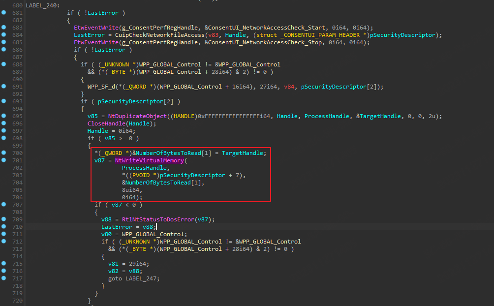 在 WinMain 函数结束的地方调用了 NtWriteVirtualMemory 写入了 TargetHandle ,而这个 TargetHandle 就是在 CuiGetTokenForApp 中获取到的管理员 token 句柄。最后又把这个这个句柄写回到了 _CONSENTUI_PARAM_HEADER+7 的位置。