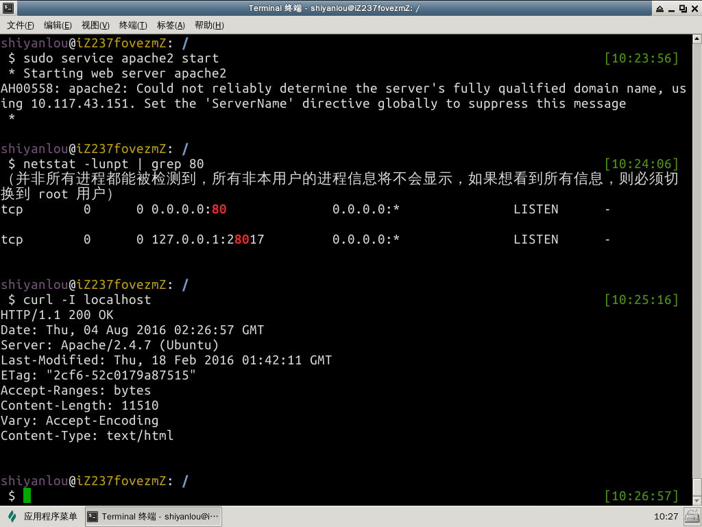 1 | #首先本实验环境没有装 apache 服务我们需要安装一下,然后启动服务 |