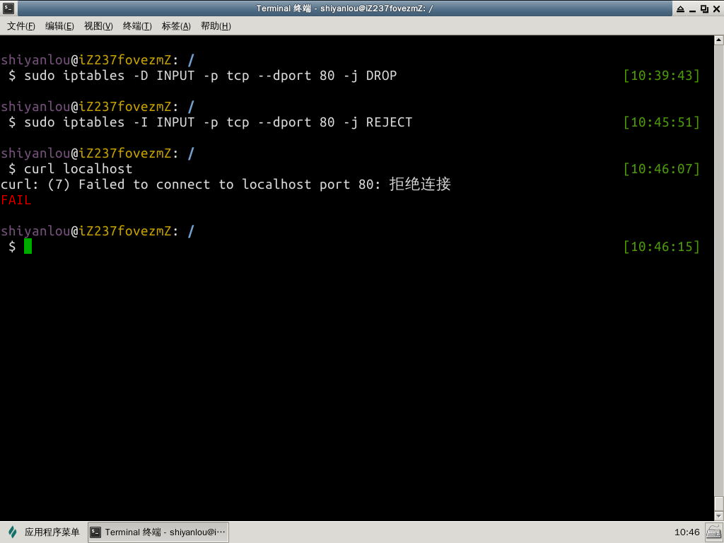 是得不到,但是为什么会一直停留在那里,是因为我们是用的 DROP 将所有来访问该页面的数据包丢掉,不给任何返回,响应,而 ~却很钟情的一直等待着服务端的响应。若我们将 DROP 行为改成 REJECT 的话,就会有返回信息说这个端口无法访问。