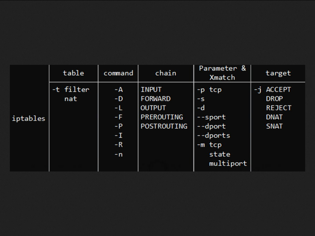 Netfilter 所设置的规则是存放在内存中的,而 iptables 通过 Netfilter 放出的内核接口 ip_tables 来对存放在内存中的 Netfilter 配置表进行修改。这个配置表主要由 tables、chains、target 组成。