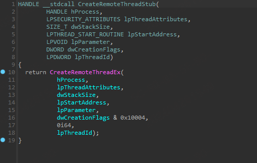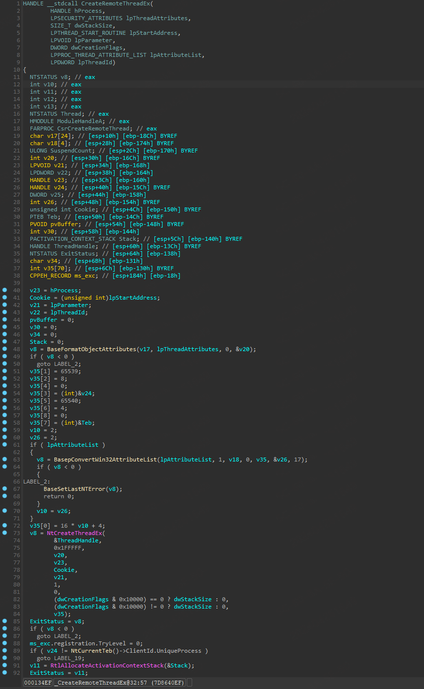 如下所示为反汇编的 CreateRemoteThreadEx 函数。