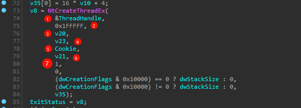 这里可以关注下第七个参数,始终为 1,这个参数表示创建的线程始终为挂起状态。参考:安全之路 —— 利用内核函数实现注入系统进程 - 倚剑问天 - 博客园