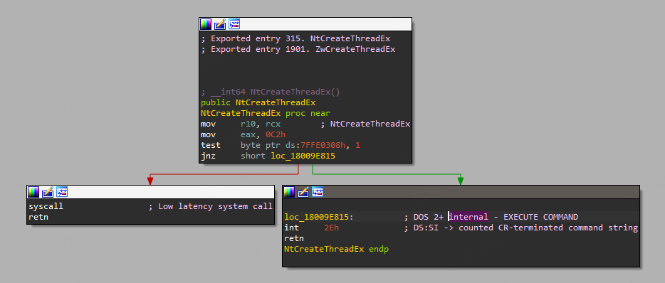 这段代码表示执行编号为 0xC7 的系统调用,如果 ds:7FFE0308h 的最低位被设置,那么在系统调用前会先跳转到另一段代码(位于 loc_1800A0525,使用int 2Eh中断进入内核)。如果该位未被设置,那么直接执行系统调用