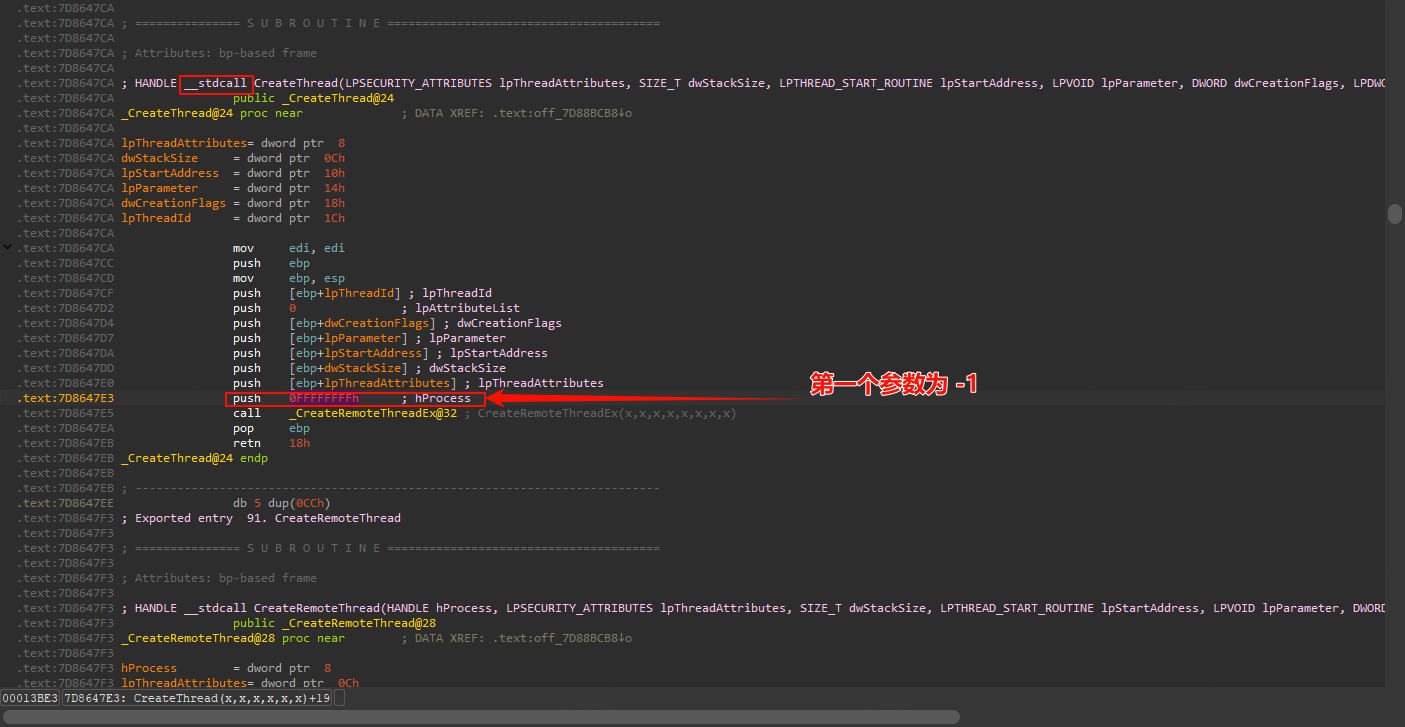 可以看到普通线程函数CreateThread也调用了CreateRemoteThread函数,只不过其线程句柄参数的值为 -1,而远程线程的句柄参数为目标进程句柄