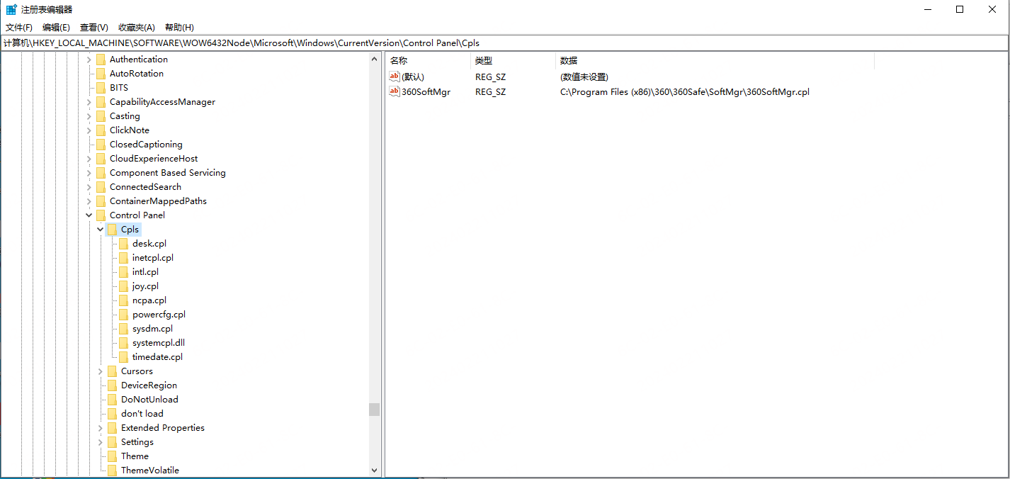 控制面板项本身通常存储在 HKEY_LOCAL_MACHINE\SOFTWARE\Microsoft\Windows\CurrentVersion\Control Panel\Cputs 或 HKEY_LOCAL_MACHINE\SOFTWARE\Wow6432Node\Microsoft\Windows\CurrentVersion\Control Panel\Cputs(对于 32 位程序在 64 位系统上的情况)中。每个控制面板项都有一个对应的 GUID,并指向其可执行文件或 DLL。