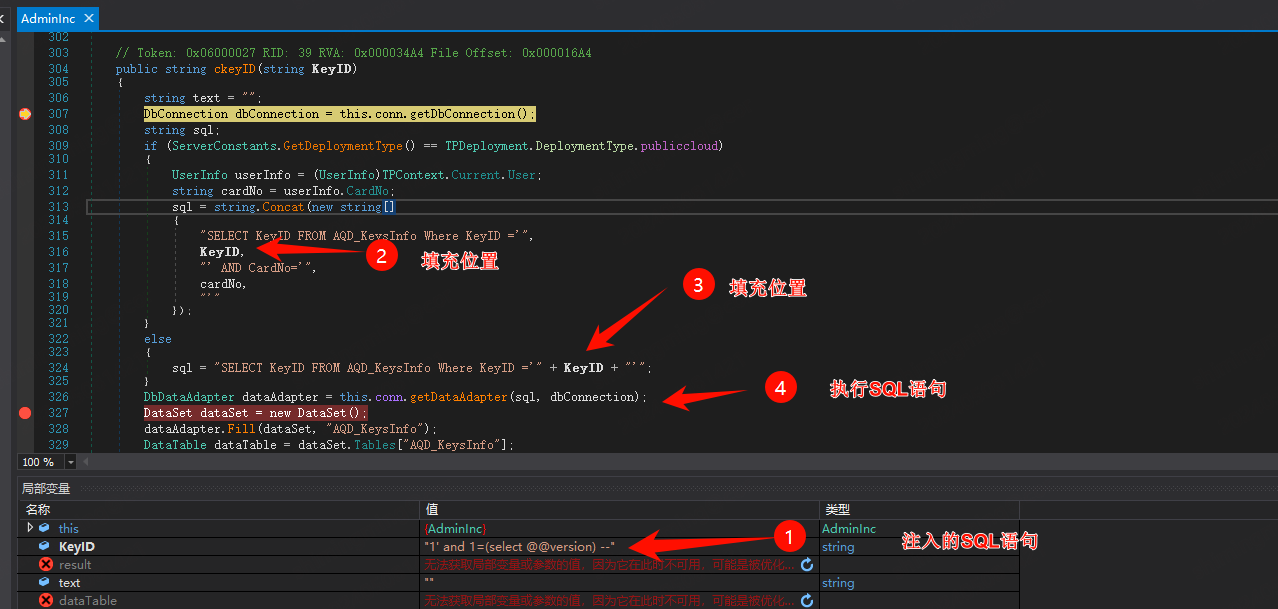 直接看调用函数,简直不要太明显。KeyID 即请求体参数中的 KeyID 参数的值,这里并没有做任何校验,直接和查询 SQL 拼接。在这里大家也需要注意这种 SQL 语句的写法,太容易被利用,至少也要做参数校验。