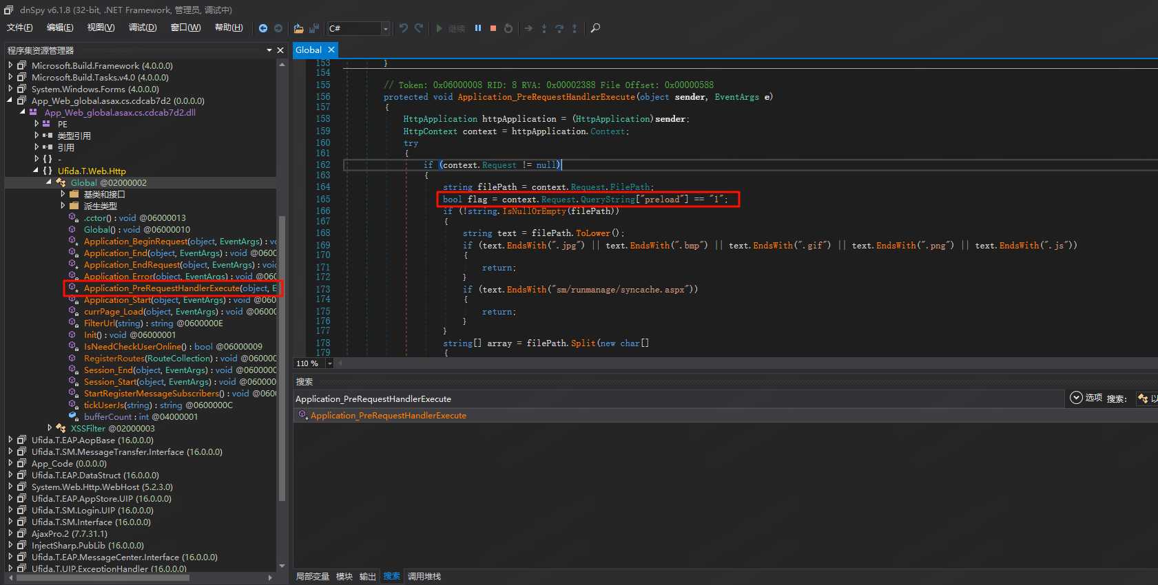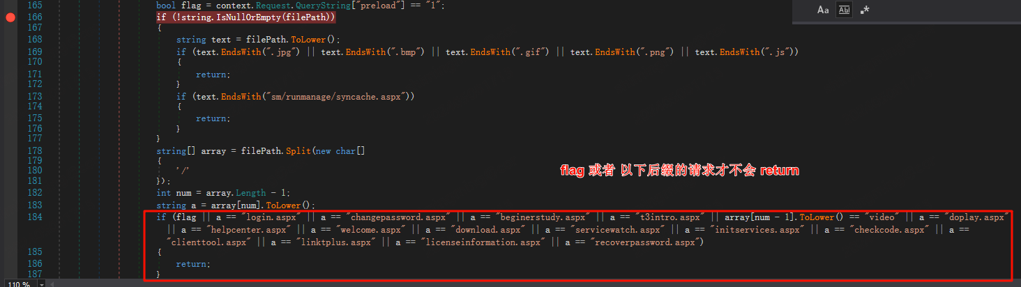 判断条件如下所示,当 flag 或者是以下所示的请求路径时,才会走到最终的请求,否则会在当前这个函数( Application_PreRequestHandlerExecute)处理请求