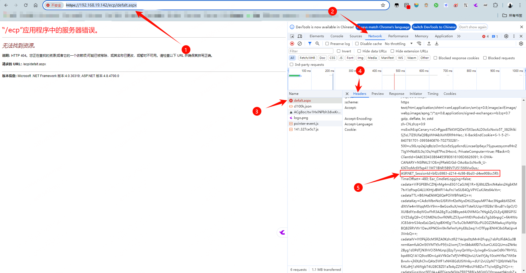 登录成功后,重定到 https://localhost/ecp/default.aspx 页面,在 DevTools 中 查看 NetWork 中的 Headers,找到 Cookie 条目,在 Cookie中找到 ASP.NET_SessionId 字段并获取值。
