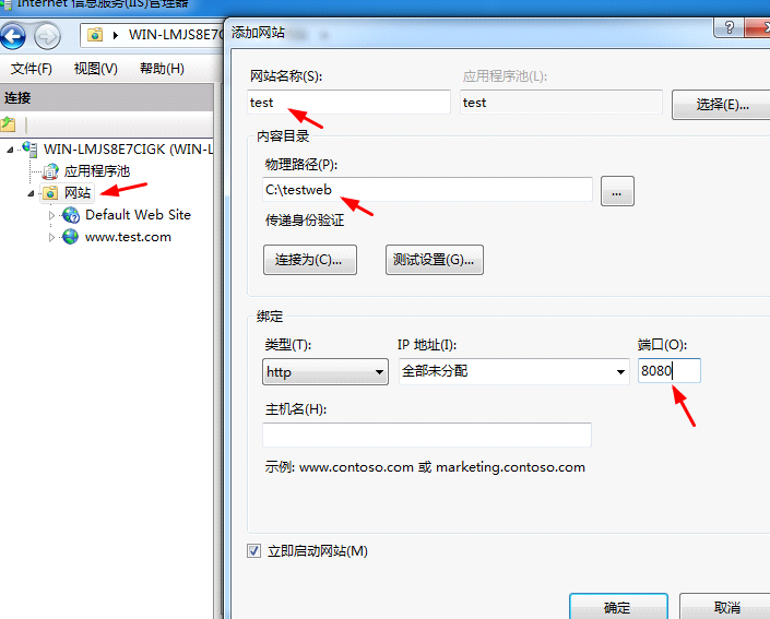 双击打开Internet 信息服务(IIS)管理器,右键网站–添加网站,名称随便写,物理路径就是上面解压后的路径,端口需要改成8080,要不提示被占用