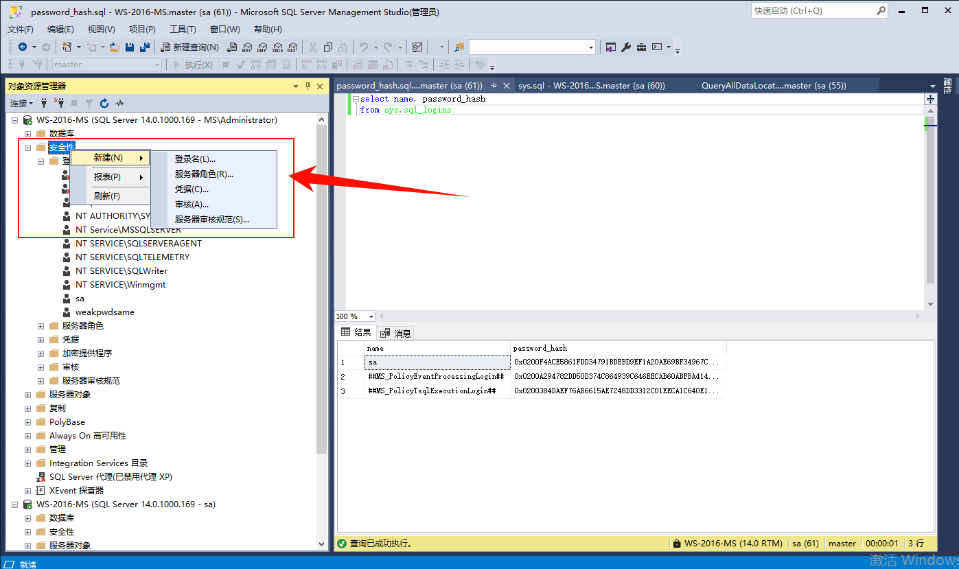 SELECT* FROM sys.sql_logins; # 或者使用 select name AS loginName, password_hash from sys.sql_logins orderby loginName;