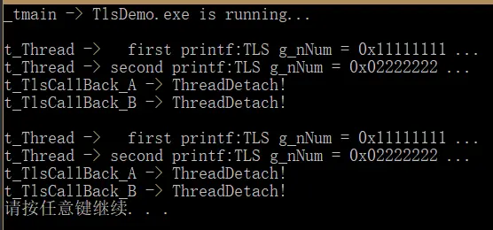 可以看见两个线程对g_nNum的操作其实是互不影响的,在程序运行到入口点之前,g_nNum已经被初始化了,以后每开辟一条新的线程,系统都会拷贝一份TLS变量的副本到该线程中。