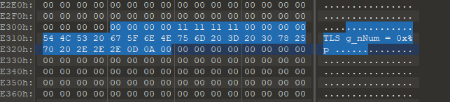 可以看到 .tls 段的起始地址为 E200h。 也就是.tls 段的偏移在 E200h位置,跳转到 E200h 看一下。