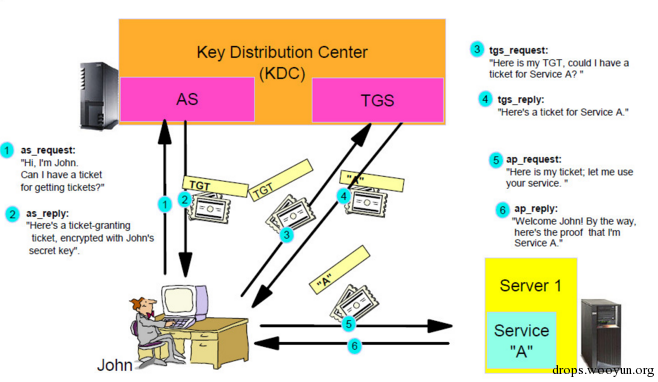存储域中所有用户的用户名和对应的NTLM Hash,可以理解为域中的SAM数据库,KDC可以从 AD 中提取域中所有用户的NTLM Hash,这是Kerberos协议能够成功实现的基础。 - KDC (Key Distribution Center):