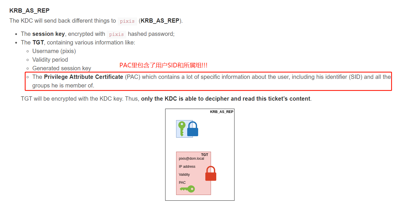 由身份认证服务授予的票据( #域渗透/票据攻击/黄金票据 ),用于身份认证,存储在内存,默认有效期为 10 小时。注意:Client密钥、TGS密钥和Service密钥均为对应用户的NTLM HashTGS密钥 ==KDC Hash==krbtgt用户的NTLM HashServer和Service可以当做一个东西,就是Client想要访问的服务器或者服务Client/(TGT/Server) SessionKey可以看做客户端与TGS服务和尝试登录的Server之间会话用来加密的密钥,而(Client/TGT/Service)密钥(上面提到的三个实际为 NTLM Hash 的密钥)是用来加密会话密钥的密钥,为了保证会话密钥的传输安全,这些加密方式均为对称加密