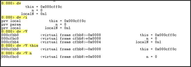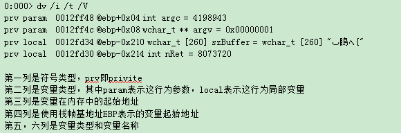 | dv /i | 查看局部变量, 并显示符号的类型和参数类型. | ||