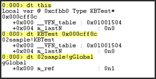 | 指定内存地址范围内搜索与指定对象相同类型的对象命令格式:s -[[Flags]]v Range Object | Object : Specifies the address of an object or the address of a pointer to an object | ||