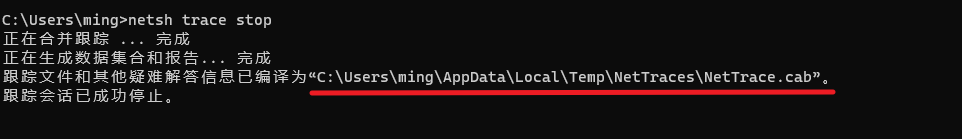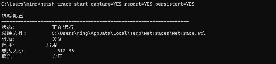 1 | netsh trace start capture=YES report=YES persistent=YES |