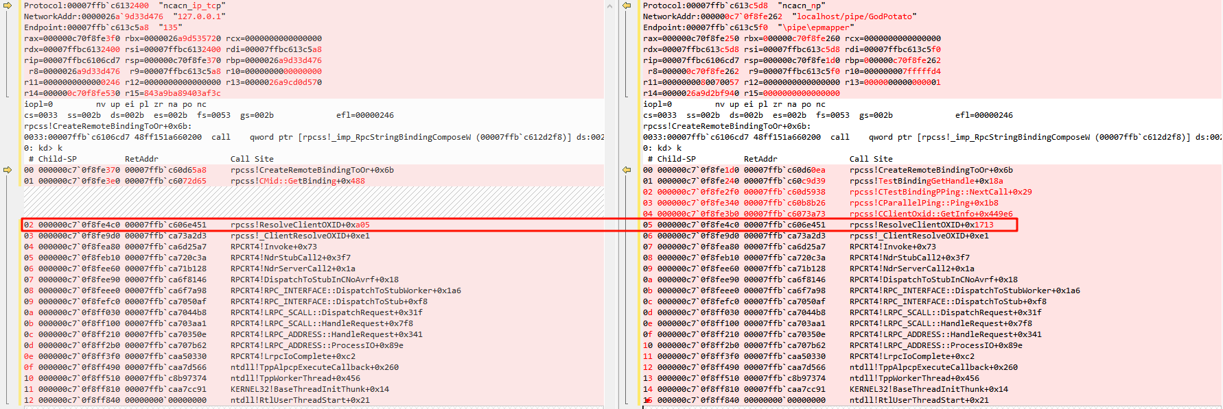 | 00 000000c7`0f8fe8d0 00007ffb`c60d2943 rpcss!ResolveOxidCommon+0x180 01 000000c7`0f8fea70 00007ffb`ca73a2d3 rpcss!ResolveOxid2+0x173 02 000000c7`0f8feb00 00007ffb`ca6d25a7 RPCRT4!Invoke+0x73 # 查看调用的服务端 1: kd> dt __MIDL_ILocalObjectExporter_0007 @r8 combase!__MIDL_ILocalObjectExporter_0007 +0x000 dwTid : 0xffffffff +0x004 dwPid : 0xbd4 +0x008 dwAuthnHint : 5 +0x00c dcomVersion : tagCOMVERSION +0x010 containerVersion : CONTAINERVERSION +0x028 ipidRemUnknown : _GUID {0000fc01-0bd4-ffff-204e-8c9f56b06ce7} +0x038 dwFlags : 0x2000000 +0x040 psa : (null) +0x048 guidProcessIdentifier : _GUID {25897763-3dc2-4432-bd48-9d5ae6f0c61c} +0x058 processHostId : 0 +0x060 clientDependencyBehavior : 0 ( OR_OXID_CLIENT_DEPENDENCY_NONE ) +0x068 packageFullName : (null) +0x070 userSid : (null) +0x078 appcontainerSid : (null) +0x080 primaryOxid : 0xb0a1aef8`d63b5b01 +0x088 primaryIpidRemUnknown : _GUID {0000fc01-0bd4-ffff-204e-8c9f56b06ce7} 1: kd> !process 0xbd4 0 Searching for Process with Cid == bd4 PROCESS ffffd1817db76080 SessionId: 1 Cid: 0bd4 Peb: 0071e000 ParentCid: 1aa4 DirBase: 104e66000 ObjectTable: ffffe18381c45700 HandleCount: 237. Image: GodPotato.exe