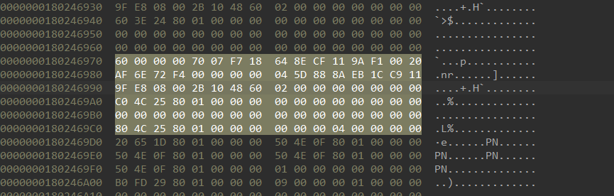 1 | // patternStream: 60 00 00 00 70 07 F7 18 64 8E CF 11 9A F1 00 20 AF 6E 72 F4 |