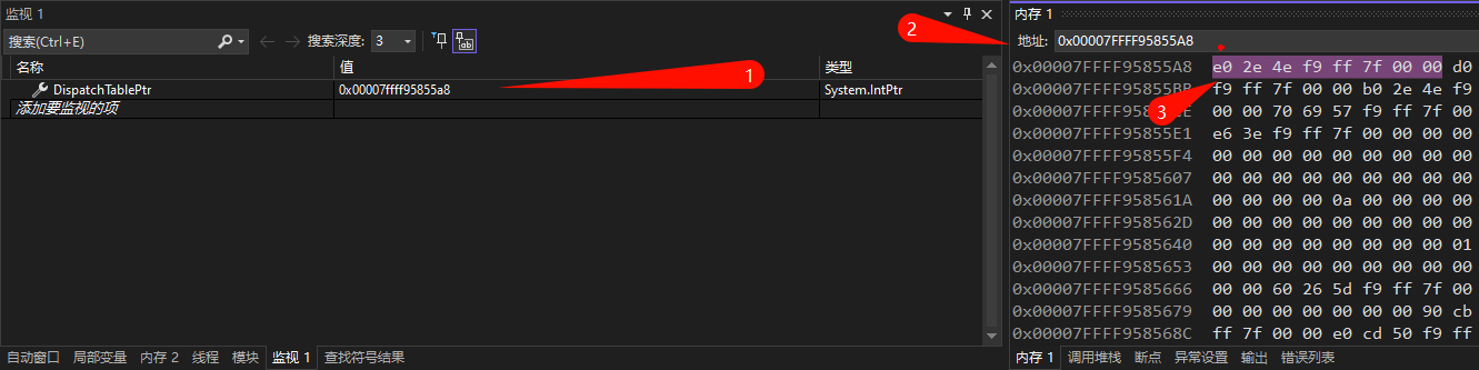 调试模式下 DispatchTablePtr 指向的内容为 0x00007ffff94e2ee0: