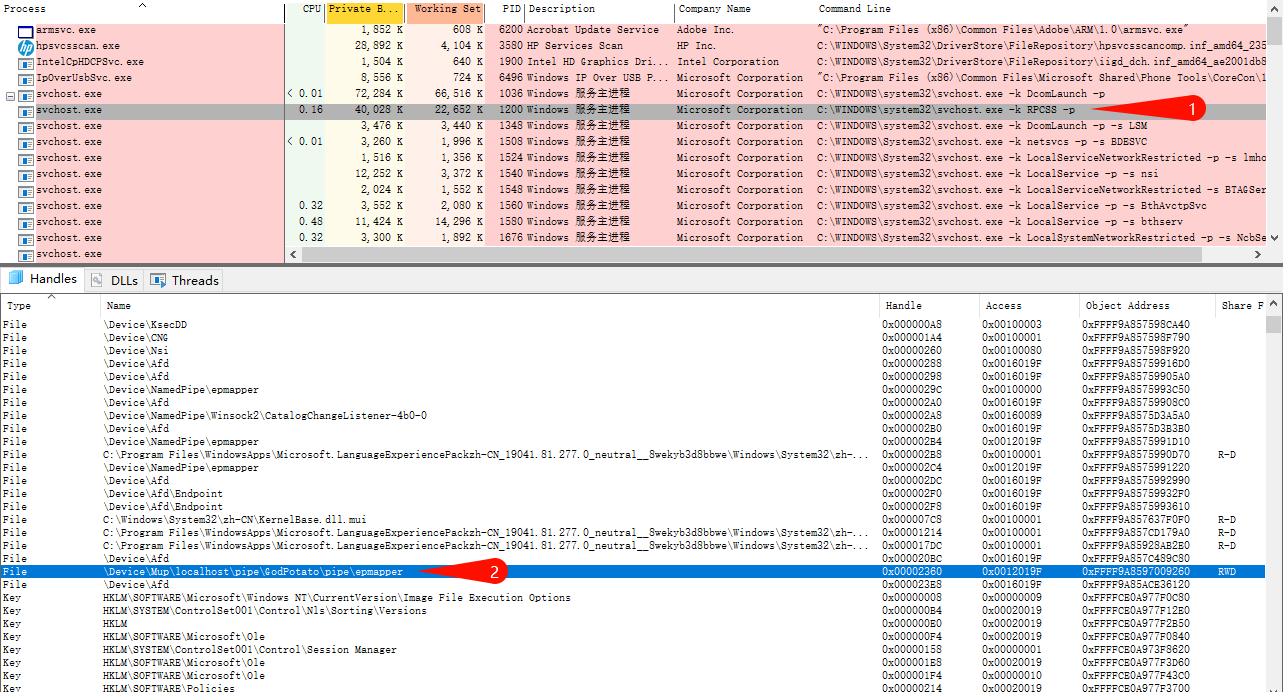 如下图所示,RPCSS 将发起的 COM 对象操作连接到了管道 GodPotato\pipe\epmapper,这一步操作是在自定义的 Hook 内完成的。