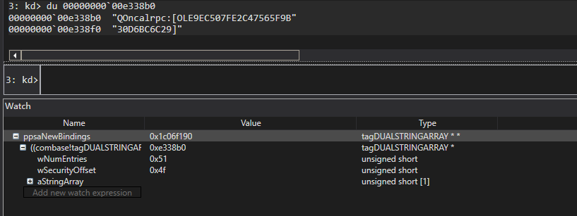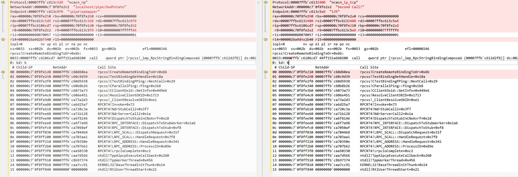 | # 两次调用的堆栈是一样的 1: kd> k # Child-SP RetAddr Call Site 00 00000016`b5afe5d0 00007fff`330560ea rpcss!CreateRemoteBindingToOr+0x6b 01 00000016`b5afe640 00007fff`33049d39 rpcss!TestBindingGetHandle+0x18a 02 00000016`b5afe6b0 00007fff`33055938 rpcss!CTestBindingPPing::NextCall+0x29 03 00000016`b5afe700 00007fff`33038b26 rpcss!CParallelPing::Ping+0x1b8 04 00000016`b5afe770 00007fff`32ff3a73 rpcss!CClientOxid::GetInfo+0x449e6 05 00000016`b5afe880 00007fff`32fee451 rpcss!ResolveClientOXID+0x1713 06 00000016`b5afed90 00007fff`36dea2d3 rpcss!_ClientResolveOXID+0xe1 07 00000016`b5afee40 00007fff`36d825a7 RPCRT4!Invoke+0x73 08 00000016`b5afeed0 00007fff`36dd0c3a RPCRT4!NdrStubCall2+0x3f7 09 00000016`b5aff220 00007fff`36dcb128 RPCRT4!NdrServerCall2+0x1a 0a 00000016`b5aff250 00007fff`36da8146 RPCRT4!DispatchToStubInCNoAvrf+0x18 0b 00000016`b5aff2a0 00007fff`36da7a98 RPCRT4!RPC_INTERFACE::DispatchToStubWorker+0x1a6 0c 00000016`b5aff380 00007fff`36db50af RPCRT4!RPC_INTERFACE::DispatchToStub+0xf8 0d 00000016`b5aff3f0 00007fff`36db44b8 RPCRT4!LRPC_SCALL::DispatchRequest+0x31f 0e 00000016`b5aff4c0 00007fff`36db3aa1 RPCRT4!LRPC_SCALL::HandleRequest+0x7f8 0f 00000016`b5aff5d0 00007fff`36db350e RPCRT4!LRPC_ADDRESS::HandleRequest+0x341 10 00000016`b5aff670 00007fff`36db7b62 RPCRT4!LRPC_ADDRESS::ProcessIO+0x89e 11 00000016`b5aff7b0 00007fff`379d0330 RPCRT4!LrpcIoComplete+0xc2 12 00000016`b5aff850 00007fff`379fd566 ntdll!TppAlpcpExecuteCallback+0x260 13 00000016`b5aff8d0 00007fff`36847374 ntdll!TppWorkerThread+0x456 14 00000016`b5affbd0 00007fff`379fcc91 KERNEL32!BaseThreadInitThunk+0x14 15 00000016`b5affc00 00000000`00000000 ntdll!RtlUserThreadStart+0x21 # RPC EndPoint 信息如下所示: Protocol:00007fff`330b2400 "ncacn_ip_tcp" NetworkAddr:00000016`b5afe662 "Second Call!" Endpoint:00007fff`330bc5a8 "135"