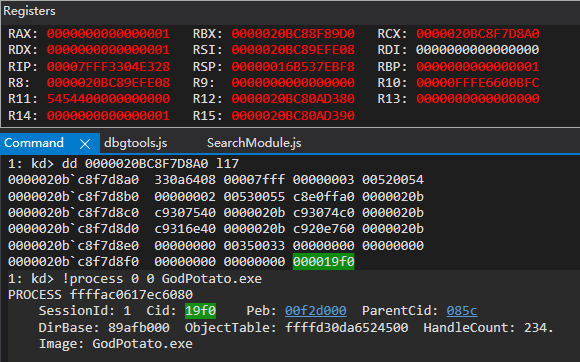 相关调试信息如下所示,可以看到目标 PID 为 GodPotato: