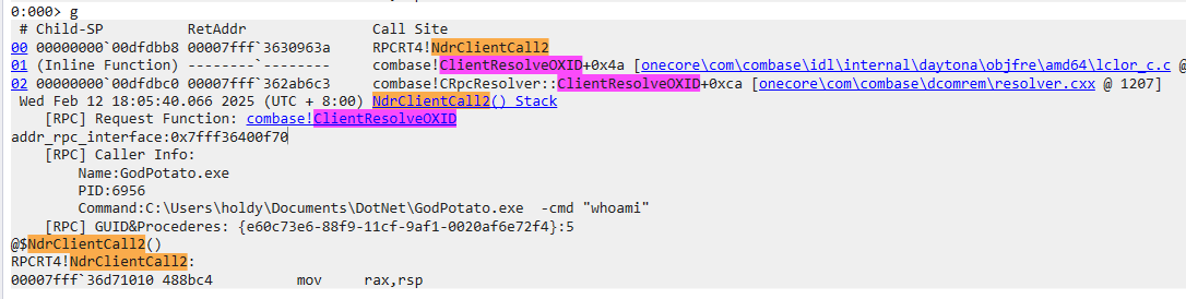 或者我们也可以在被调试程序(GodPotato)中添加 RPCRT4!NdrClientCall2 断点查看 RPC 都调用了那些接口: