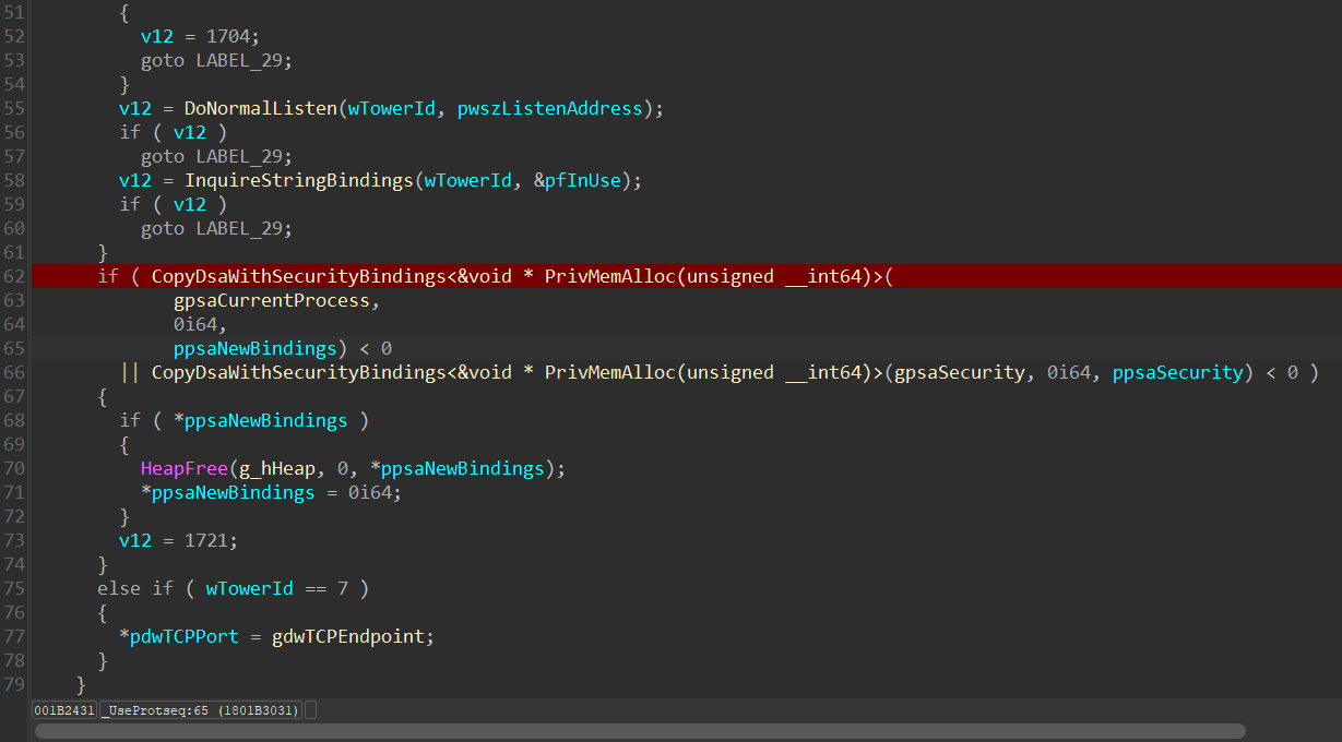 在不Hook情况下调用时,UseProtSeq 中通过 CopyDsaWithSecurityBindings 获取绑定的信息,如下所示: