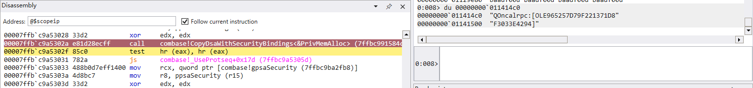 代码部分我们已经了解了,那么调试部分就比较简单了,双机调试挂载目标进程,在 combase!_UseProtseq 处下断点即可。当然,整体的流程可以结合 IDA 反汇编的代码查看。