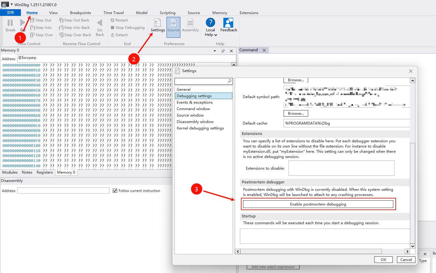 以下文本是如何将 WinDbg 设置为调试器的示例。