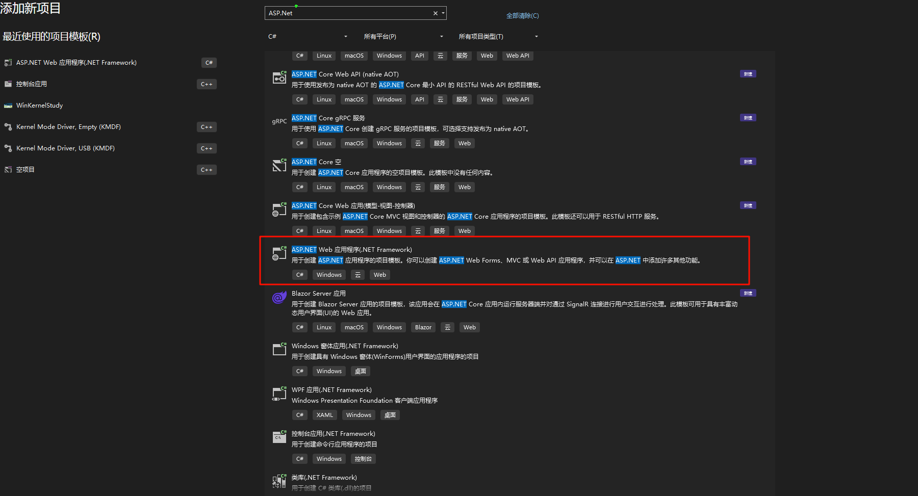 选择如下所示的项目,然后根据自己需要填写项目名就可以,默认模版就可以。如果没有该模板的话,则需要安装相关开发插件。参考微软官方教程: